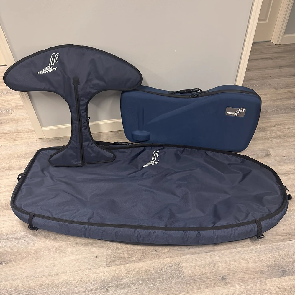 - Complete ready-to-ride used efoil kit with charger, wings, controller, covers, and bags.